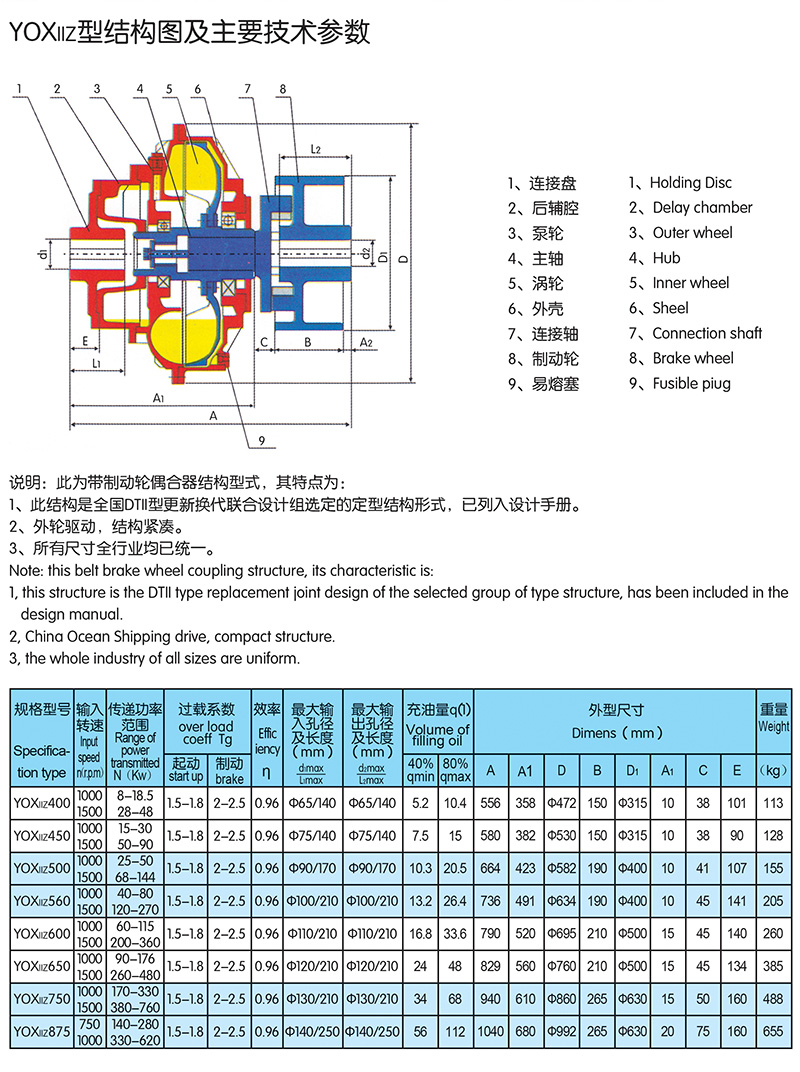 限矩型液力偶合器是一種動力式液力傳動元件,它具有過載保護作用,能隔離扭振和沖擊,在多臺電動機傳動鏈中均衡各電動機的負(fù)荷,并減小電網(wǎng)的沖擊電流。在礦山機械、化學(xué)工業(yè)、治金工業(yè)、食品、建筑、交通等部分得到了廣泛應(yīng)用。 限矩型液力偶合器具有以下特點:效率高,結(jié)構(gòu)簡單,能夠帶動負(fù)載平穩(wěn)起動,改善起動性能,提高起動能力。 具有過載保護作用。能隔離扭振和沖擊。在多臺電動機傳動鏈中均衡各電動機的負(fù)荷。并減小電網(wǎng)的沖擊電流。